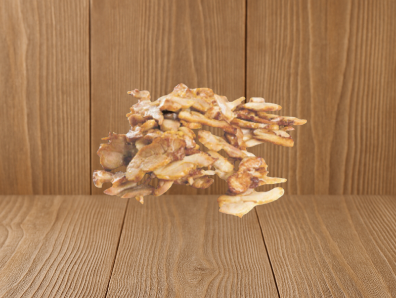 Ingrediënten: 92% kippenvlees, zout, gemengde kruiden en specerijen (bevat MOSTERDpoeder), smaakversterker E621, gehydroliseerd plantaardig eiwit (HVP), suiker, kruidenextract, stabilisator E451, E450, voedingszuur E331, E262, SOJAeiwit, gemodificeerd zetmeel, zetmeel dextrose, glucosestroop, verdikkingsmiddel E407.